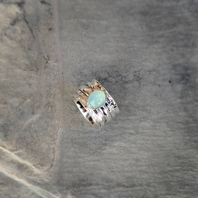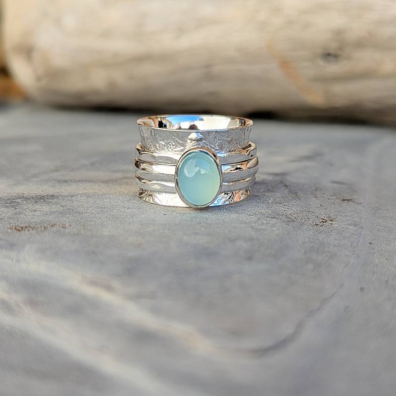 La bague anti stress argent et calcédoine aqua est une nouvelle création, toute douce. L’anneau central est composé d’argent délicatement gravé de motifs floraux. L’intérieur de la bague est parfaitement poli et elle est si douce à porter que vous ne l’enlèverait plus! Sur les trois anneaux tournants, deux sont en argent martelé. Quant à l’anneau central, il est lisse et orné d’une magnifique calcédoine aqua, au bombé généreux.