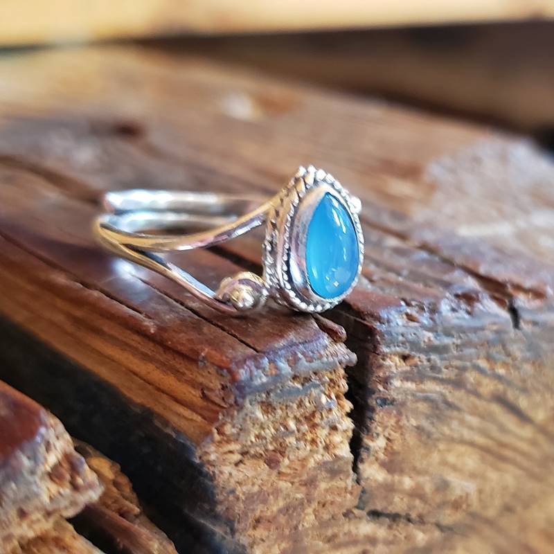 La bague calcédoine bleue ajustable est un bijou en argent 925 fait-main. Une bague réglable, parfaite pour les doigts fins à moyens. Son design fin reste pourtant solide et la partie ouverte de l’anneau comporte une finition ronde pour éviter les accros.