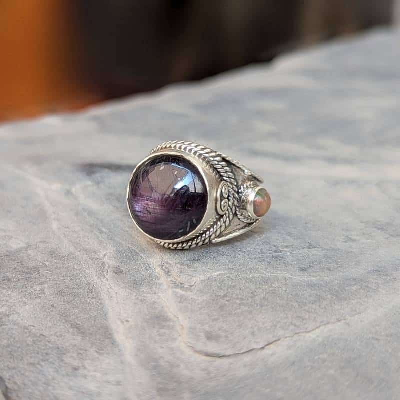 Caractéristiques de la bague ethnique en rubis indien et opale blanche