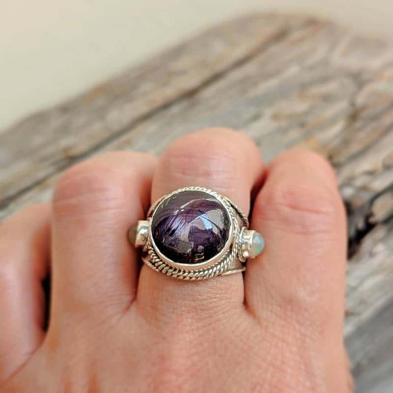 La bague ethnique en rubis indien et opale blanche est une pièce unique fait-main au cœur du Rajasthan, en Inde. Nous avons créé ce modèle avec Soni, un de nos artisans-partenaires de cette région. Un design ethnique magnifique, qui a beaucoup de caractère tout en restant délicat, par sa finesse. La composition est faite d’arabesque et de fines tresses d’argent. Un superbe travail, minutieusement exécuté dans un argent massif de qualité. La pierre centrale est un rubis indien, au mauve profond et une étoile qui attrape la lumière. Les deux petites opales blanches sur les côtés soulignent l’originalité de cette création.