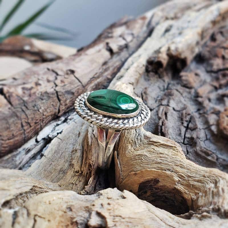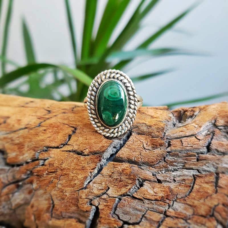 La bague malachite argent est une superbe pièce unique, au design bohème. La pierre fine est une malachite, aux verts envoutants. Elle fait penser à un forêt amazonienne aux mille tons de vert qui laisse rêveur.