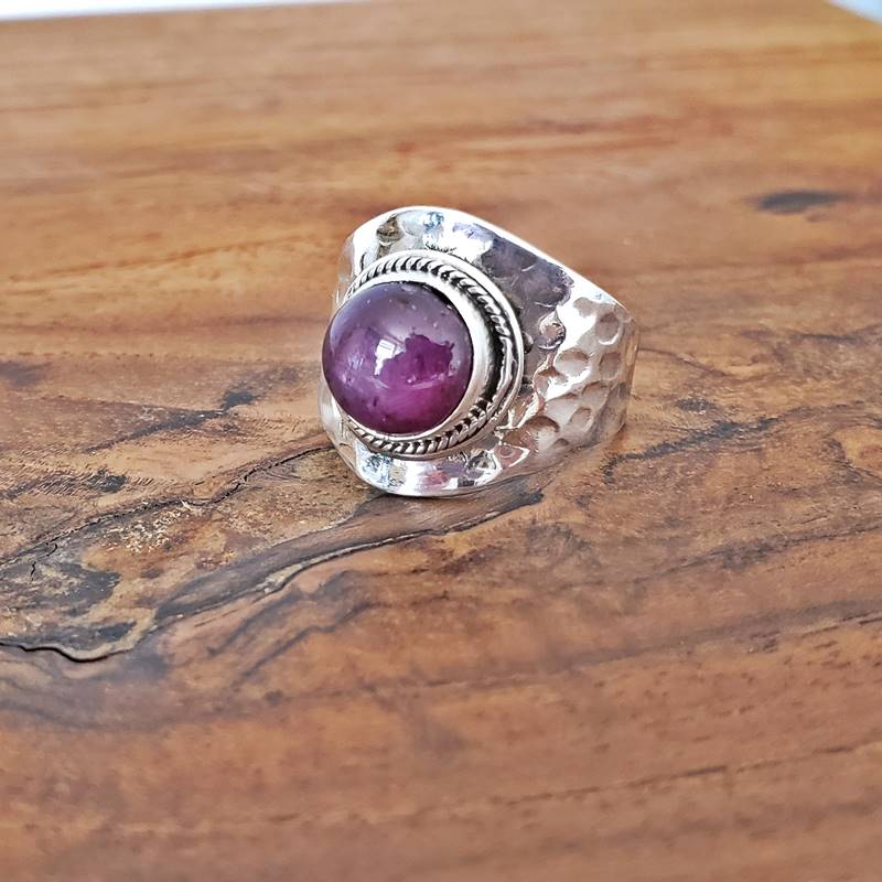 La bague rubis étoilé argent martelé est bijou contemporain. Son design de bague large et martelée en fait une intemporelle. La pierre naturelle est un rubis étoilé indien, aux tons mauve et rose profond et une étoile qui attrape la lumière.