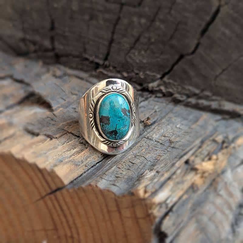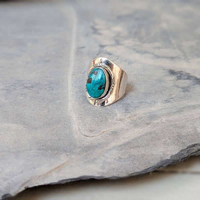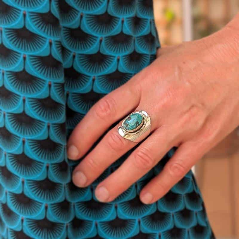 La bague turquoise argent OM est une pièce unique et 100% fait-main. Cette bague au design ethnique chic, s’inspire des bijoux traditionnels indiens. Elle a vu le jour dans l’atelier de Soni, au cœur du Rajasthan, en Inde. Le travail de l’argent est magnifique, avec un sertissage réhaussé et des motifs martelés.