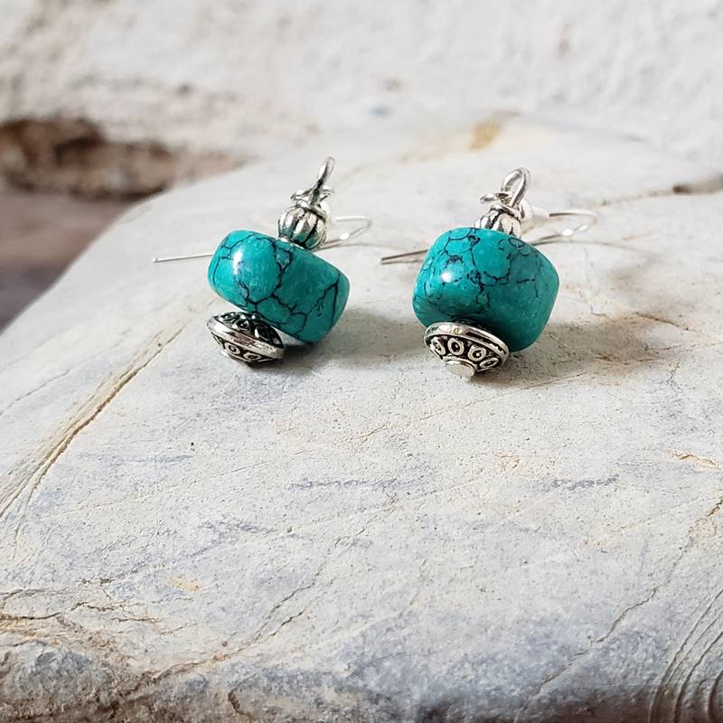 Les boucles d’oreilles turquoise YOGI ont été fait-main au Népal. Elles sont composées de jolies turquoises, à la découpe légèrement irrégulière. Ce modèle fait partie de la collection Stupa car leur design rappelle celui d’un stupa bouddhiste. C’est avec Mahesh, à Katmandou, que nous avons créé ce modèle.