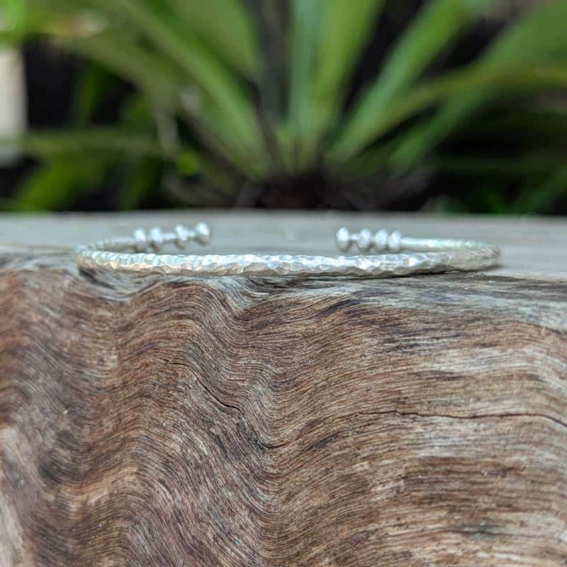 Le bracelet jonc tribal en argent martelé est une création traditionnelle magnifique. Un artisan de la tribu Karen, au nord de la Thaïlande, a façonné cette pièce entièrement à la main, avec une précision et un savoir-faire rare.