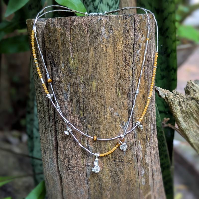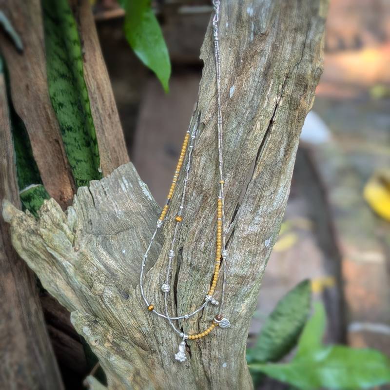 Le collier double rang en calcite jaune est une création artisanale exotique. Ce collier floral a été fait-main à Chiang Maï, dans le nord de la Thaïlande. C’est avec Hansa, que nous avons inventé ce nouveau bijou. Sa composition est toute en asymétrie, avec de petites perles de calcite jaune, quelques boules d’œil de tigre facettées et des apprêts en argent fait-main par un artisan des tribus Karen. Ce collier est une pièce unique qui saura se faire remarquer.