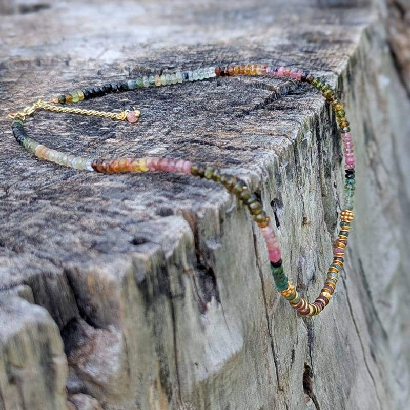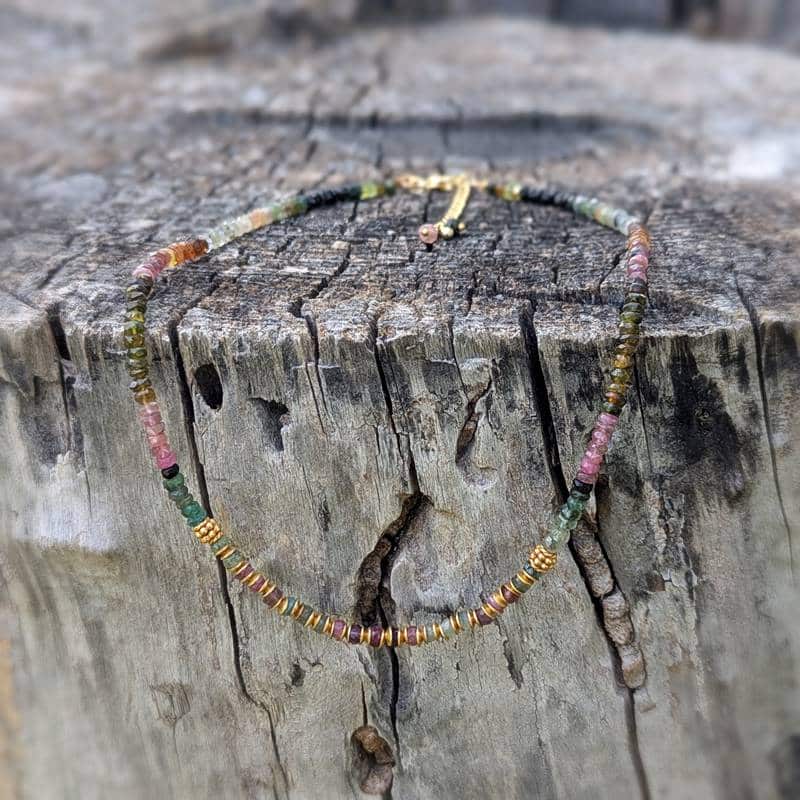 Le collier tourmaline multicolore ISHI est une création artisanale colorée. Composé de tourmalines naturelles facettées et de disques dorés, ce modèle offre un design bohème chic.