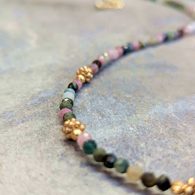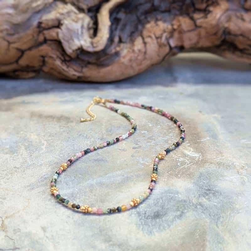 Le collier tourmaline multicolore KI est une création toute en finesse. Composé de petites tourmalines multicolore, ce modèle offre un design à la fois bohème et épuré. Ajustable, ce collier convient aux cous fins à moyens, grâce à sa chaînette de rallongement.