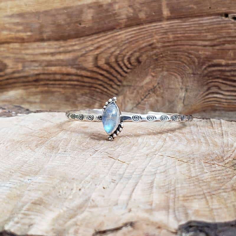 Le jonc pierre de lune argent est une superbe pièce unique au style ethnique chic. Un argent travaillé entoure la pierre de lune naturelle. Ces jolis reflets bleutés donne encore plus de charme à ce bracelet. Le jonc est composé d’une bande d’argent travaillé et finement gravée.