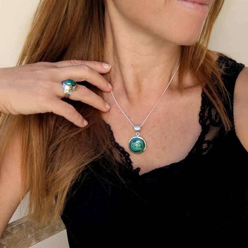 Le pendentif argent et malachite NATURE est une pièce unique. C’est un bijou de créateur au design moderne et épuré. La pierre naturelle offre des verts intenses avec des cercles et des courbes plus foncées. Ce pendentif aux couleurs nature a été créé en collaboration avec un de nos artisan-partenaire du Rajasthan, en Inde.