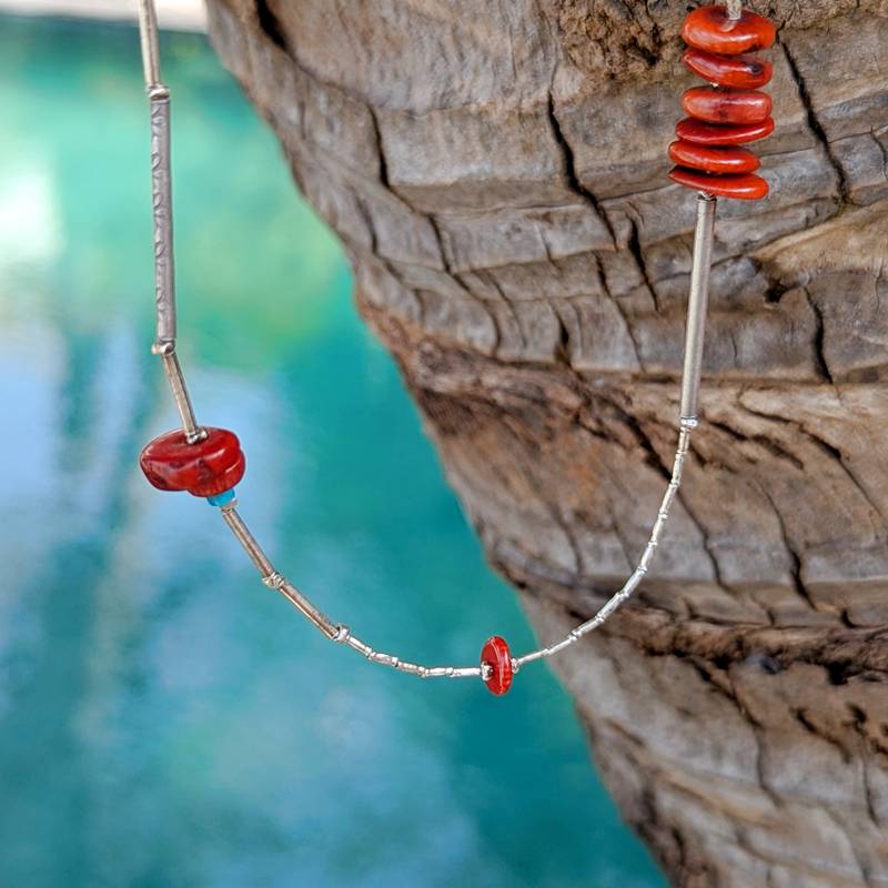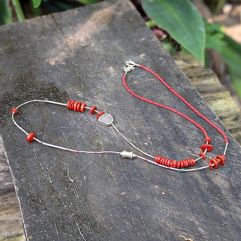 Le sautoir en corail rouge et argent est une fabuleuse pièce unique. Ce magnifique collier vient de l’inspiration d’une thaïlandaise, une française et une japonaise. Lors de notre dernier voyage de création en Thaïlande, une rencontre inattendue a donné naissance à ce bijou artisanal. Composé de corail rouge naturel, de formes et de tailles variées, il est agrémenté de quelques minuscules turquoises. Les tubes d’argent et les apprêts sont eux aussi variés et tailles et formes. Vous pouvez porter ce sautoir en collier long ou le doubler pour le porter en collier.