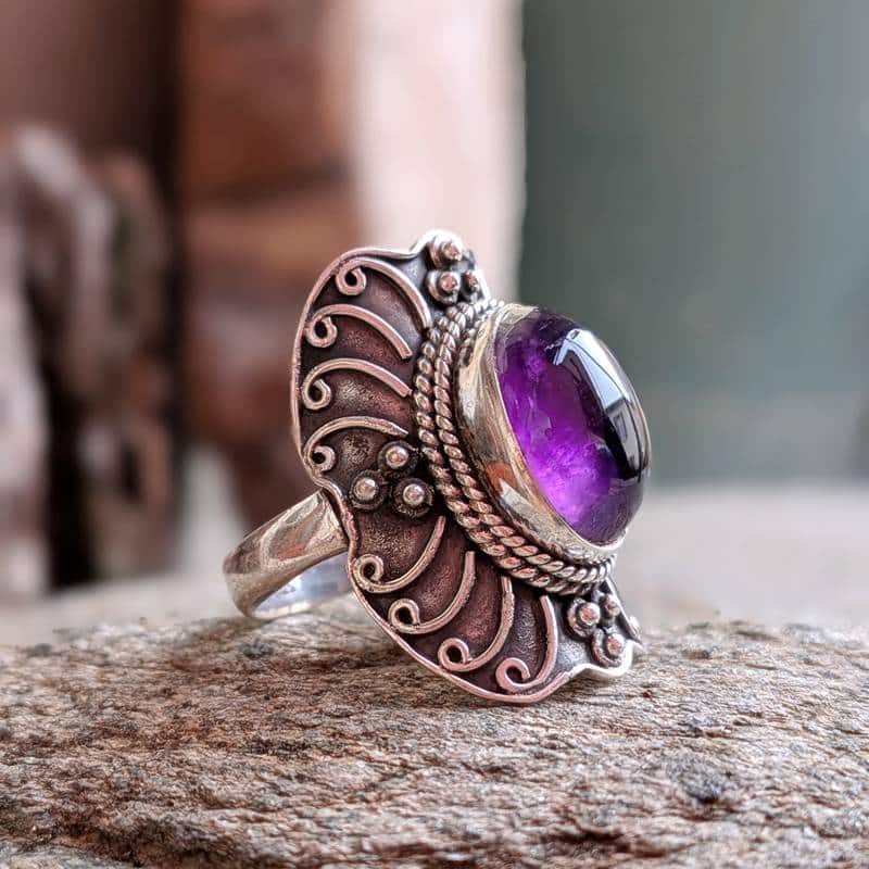 La bague améthyste argent est une superbe pièce unique, aux couleurs fabuleuses. Ce modèle au design ethnique a été délicatement travaillé, dans un argent 925 de qualité. La pierre naturelle est un cabochon de belle taille en améthyste naturelle. Nous avons créé ce modèle avec Soni, un de nos artisans-partenaires du Rajasthan, en Inde.