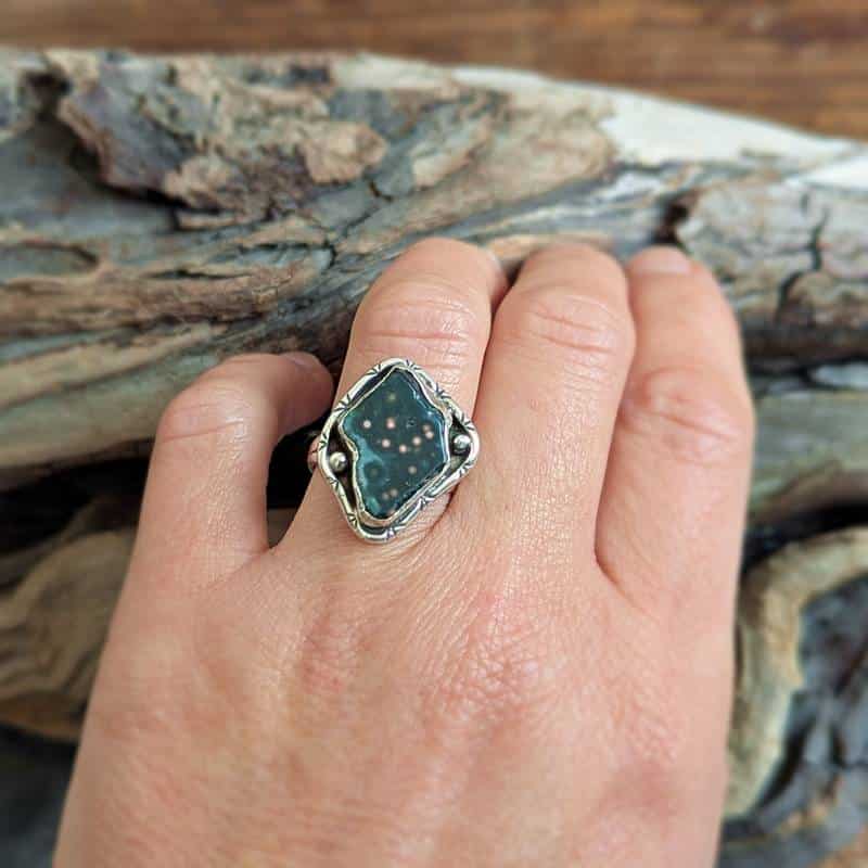 La bague en jaspe orbiculaire argent est une superbe pièce unique. La pierre naturelle vient de Madagascar, où se trouve la seule mine de jaspe orbiculaire au monde. De teinte vert foncé à vert clair et parsemées de points orangés, la pierre de jaspe laisse rêveur.
