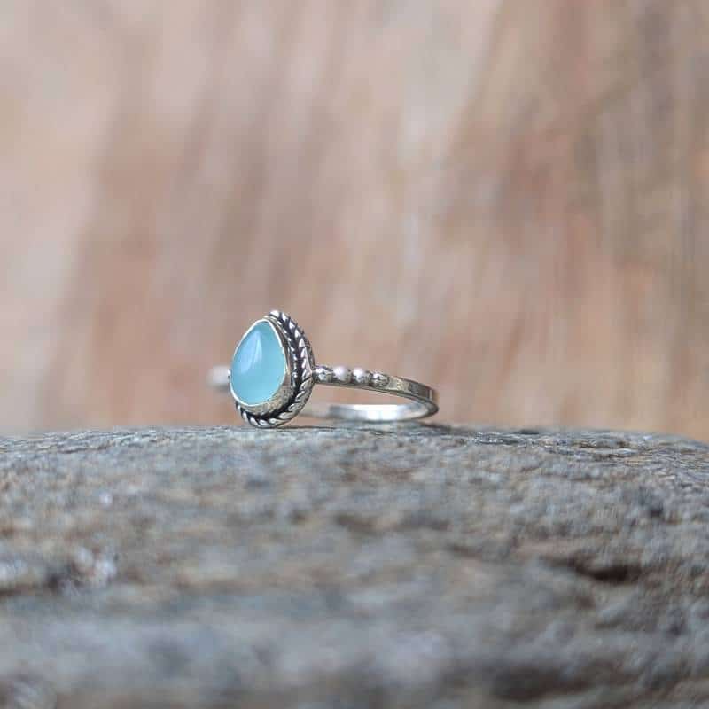 Elégante et délicate, la bague fine calcédoine argent perlé est un modèle exquis. La pierre naturelle est taillée en forme de petite goutte au bombé généreux. C’est un bijou fin qui se porte bien seul ou en association avec d’autres bagues fines.