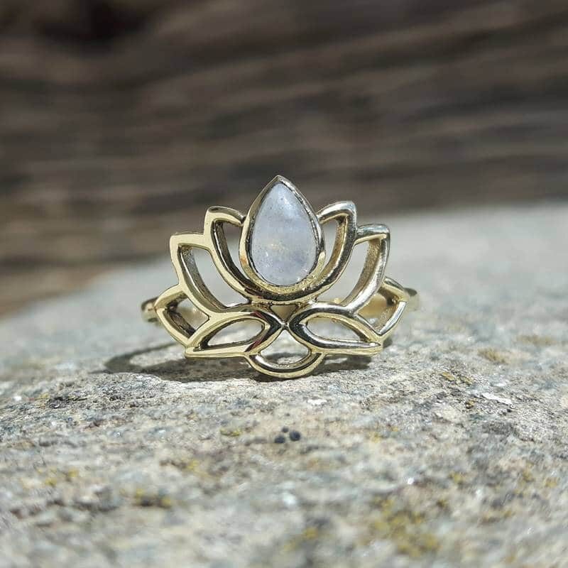 Une bague fine et délicate. Cette bague fleur de lotus avec une petite pierre de lune a été fait-main par un artisan de talent. La pierre naturelle est très jolie, avec parfois des reflets bleutés. Une attention toute particulière a été apportée aux finitions de ce bijou.