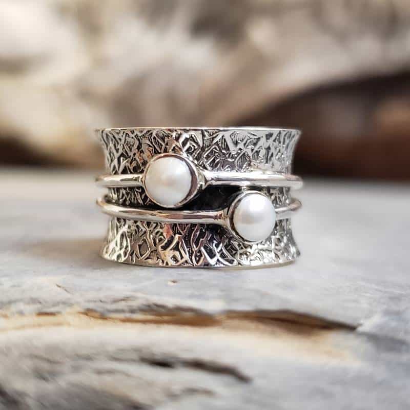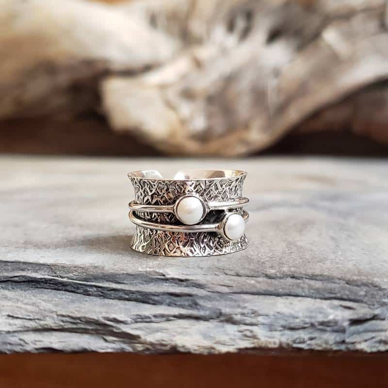 La bague perles de culture argent PETITES ÎLES a été fait-main par un artisan aux doigts de fée. Cette magnifique pièce unique offre un design original. L’anneau principal est composé d’une large bande d’argent martelé, légèrement convexe et très doux à porter. Ajustable, ce bijou convient aux doigts fins à moyens.