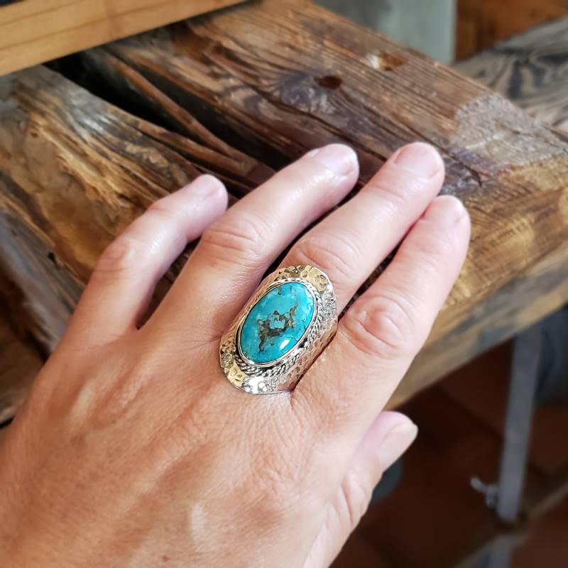 Cette bague turquoise large argent est une fabuleuse pièce unique. La bague est composée d’un anneau large en argent martelé, poli avec minutie. La turquoise naturelle a été sertie en hauteur pour la mettre parfaitement en valeur. Deux tresses et des petites bagues en argent agrémentent le sertissage. Ce design bohème chic a vu le jour dans l’atelier de Soni, notre artisan-partenaire en Inde. Nous avons conçu ensemble cette pièce unique.