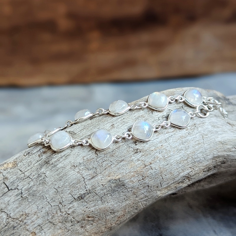 Ce bracelet pierre de lune argent ajustable est une pièce magnifique. Les pierres fines sont des pierres de lune naturelles, aux reflets bleus, qui varient avec la lumière et attrapent le regard. Un modèle ajustable parfait pour les poignets fins à moyens.