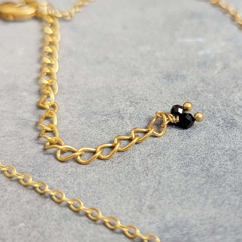 Le collier onyx noir goutte AMRITSAR est une création artisanale. Ses formes délicates ont étés façonnée entre les doigts d’un artisan de talent. Entièrement fait-main ce collier en laiton est de belle qualité est bien fini. Les onyx naturelles sont facettées et scintillent au grès des changement de lumière. Le collier est ajustable, et peut se porter court ou de manière classique.