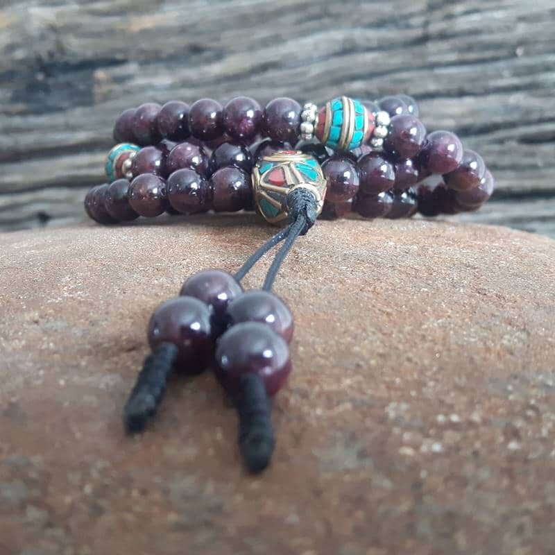 Ce mala tibétain en grenat est une pièce magnifique, entièrement fait-main. Composé de pierres semi-précieuses, ce collier est agrémenté de quelques perles tibétaines. Ces perles sont tout en simplicité et faites de laiton et de lamelles de turquoises et de corail. Ce sont des points d’arrêt du mala, et aident à fractionner le comptage des mantras.